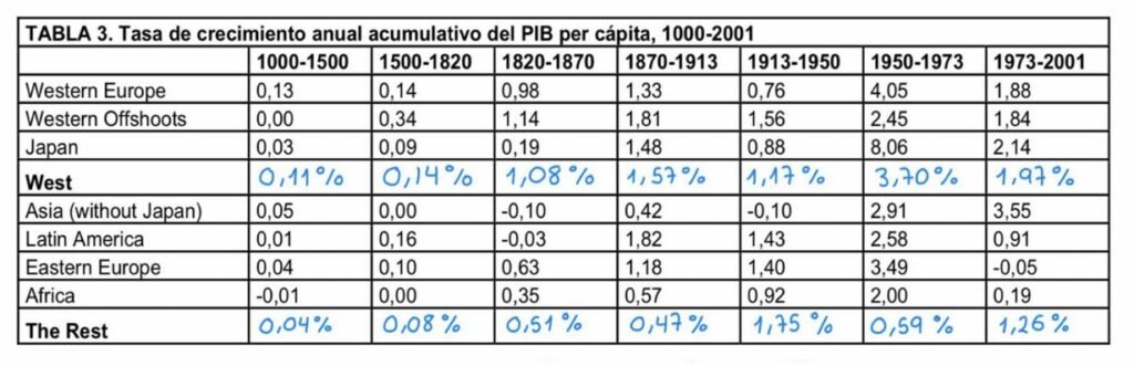 Durante el seminario, además de hacer gráficos, también calculamos las tasas de crecimiento del PIB per cápita usando una fórmula específica. Esto nos ayudó a ver, de forma cuantitativa, que ese crecimiento moderno es algo reciente y que no ha sido igual para todos. Por ejemplo, entre 1820 y 2001, el crecimiento acumulado de Occidente ha sido mucho mayor que el del resto del mundo.