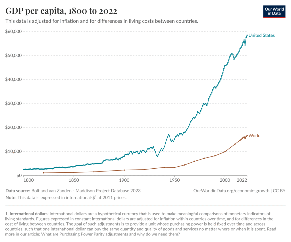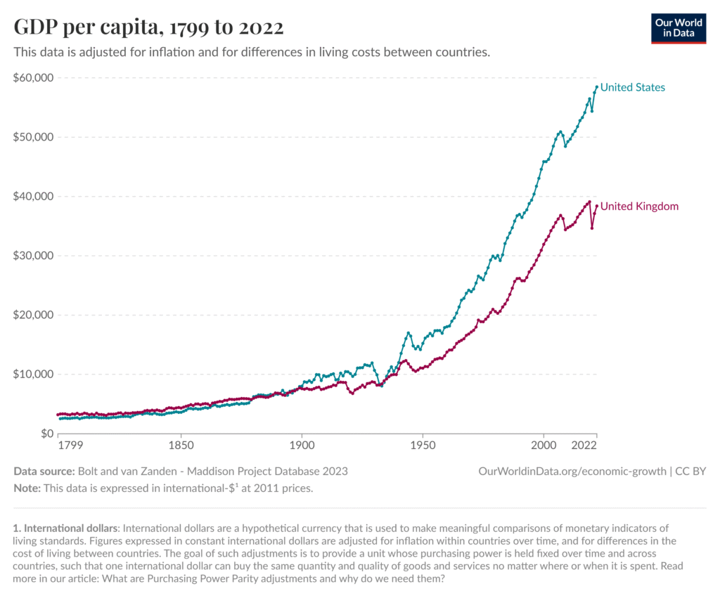 En 1800, Reino Unido poseía un PIB per cápita más alto que los Estados Unidos. Estaba más industrializado y tenía un sistema productivo avanzado. Pero con el tiempo esto cambió. Estados Unidos se expandió rápidamente, con un mercado interno robusto y un sistema económico adaptable. Después de la Guerra Civil, la nación unificó su territorio, expandió la producción agrícola e industrial, y aprovechó los avances tecnológicos.